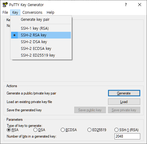 Key 메뉴에서 SSH-2 RSA key를 선택. 그리고 아래의 Parameters의 Type of key to generate 부분을 RSA로 선택. 그리고 맨 아래의 Number of bits in a generated key를 기본값인 2048로 선택합니다. 그리고 Generate!