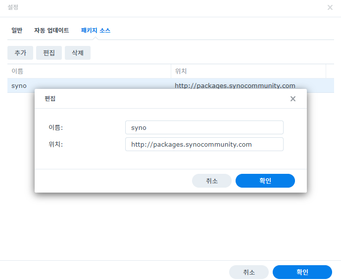 패키지센터 > 설정에 들어가서 패키지 소스에 다음과 같이 입력(혹은 추가)