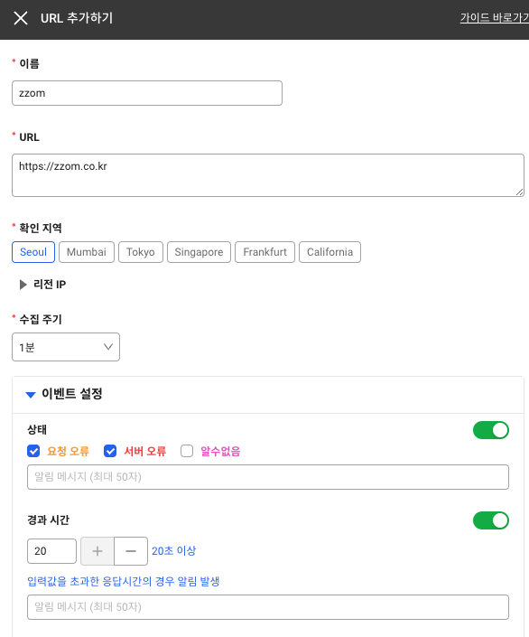 생성 하면 바로 등록한 url이 없다고 나온다. 이때 url 추가하기를 눌러 아래와 같이 모니터링할 웹주소 등을 입력한다.