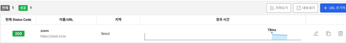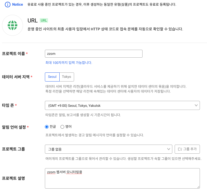 생성 하면 바로 등록한 url이 없다고 나온다. 이때 url 추가하기를 눌러 아래와 같이 모니터링할 웹주소 등을 입력한다.