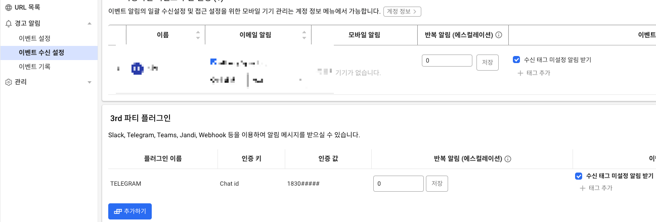 좌측 메뉴 중 [경고알림 - 이벤트 수신설정]을 눌러보면 아래 이미지처럼 나온다.