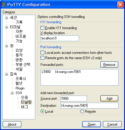 우선 putty설정...을 통한 접속